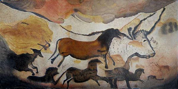 When is a cow not a cow? Okay here's a riddle, What do you call a cow that is too long? A dachshund! How does that fit in here? The story goes like this. Tim's turn to drive I think but it doesn't matter. He is driving because we are trying to paintoutdoors this winter in his older car. He got the heater fixed along with the alternator and battery after lightning hit a tree and I think his car. The car, well, because it was broken after the storm and lightning struck with the car only yards away from the tree. I've included the cave painting because that's what we felt like we were trying to paint in a sedan with me in the backseat and Tim in the front.Tim gets set up a little quicker as he has his paper on the board and he only has to open his two boxes of pastels, the hard pastels and the soft pastels. Me on the other hand,in the backseat am trying to balance my canvas on my knees, get my paints out of the bucket, pour water into a pail and sort out my brushes. This doesn't include squeezing paint into my lidded palette box. Soooo,we get started. Tim is a 'pastel pecker' that is, he applies his pastels like a woodpecker taps on a tree, no 'not taps' bangs on the tree. Me in the back am trying to lay down a brush stroke with the canvas bobbing like a red and white float at the end of a cane pole with a bluegill on the other end. I start laughing and can't stop. He starts laughing and pretty soon the windows fog up Now, a truck pulls up and a man rolls down his window."Hey you guys ok? Need any help." We have pulled off the main road which is out in the county somewhere. It's a lane, more like it. Tim tells him "no." we are just painters. The guy nods. Tim holds up his pastel and the guy is satisfied. He pulls away and Tim and I bust out laughing cause it looks suspicious! Hell, now how else are we going to paint outdoors with out people coming along and asking us if we are all right with the windows fogged up and the car running with the heater blasting away. I'm getting so hot that I have to lay everything on the seat where there is little room to do anything like paint and open the door to strip off my two sweatshirts and climb back in. Guess whose laughing? A few minutes later Tim starts laughing again and tells me his cows look like horses. Mine, I reply look like pigs. Well, we start laughing again and I swear we haven't had a drop of liquor. Those cave painters making cows I mean "aurachs" on the cave walls must have had some fun. Up on scaffolding brushing raw pigment onto the rock surface a few inches inches in front of their noses with little room to move around and see what they are doing.Add to this a crappy little fat wick lamp supplying a 1/4 candlewatt. "Hey Grok,do my horses look like horses? Smorg falls off the scaffolding laughing at Grok because his horses look like pigs and dachunds. That accounts for the broken arm and the three scratches of red on the wall as Smorg angrily jabs at the wall with a loaded brush in his hand as he is falling. And you now know why painting outdoors in the winter is a test of endurance and the those big muscles on the sides of our heads that make us all laugh.Thursday, December 9, 2010